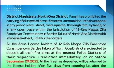 गोवा खबर:उत्तर गोव्यातील १२-रेईस मागूस जिल्हा पंचायत मतदारसंघाच्या १६ ऑक्टोबर २०२२ रोजी होणाऱ्या पोटनिवडणूकेच्या पार्श्वभूमीवर उत्तर गोवा जिल्हा न्यायदंडाधिकाऱ्यानी रेईस मागूस जिल्हा पंचायत मतदारसंघाच्या कोणत्याही सार्वजनिक...