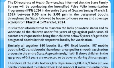 गोवा खबर:आरोग्य सेवा संचालनालयाने राज्य कुटुंब कल्याण मंडळाच्यावतीने रविवार ३ मार्च २०२४ रोजी सकाळी ८.०० ते संध्याकाळी ५.०० या वेळेत संपूर्ण गोवा राज्यात राष्ट्रीय पल्स पोलिओ...