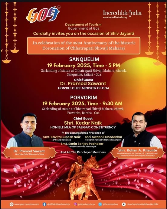 जाहिरात ADVT Join us in honoring the legacy of #ChhatrapatiShivajiMaharaj on the anniversary of his historic coronation! Published 1 year ago on February 19, 2025 By Devendra Walavalkar Spread the love ADVT Join us in honoring the legacy of #ChhatrapatiShivajiMaharaj on the anniversary of his historic coronation! 19th February 2025 | 9:30 AM Chhatrapati Shivaji Maharaj Chowk, Porvorim, Bardez – Goa A grand celebration awaits with the garlanding ceremony, cultural performances, and the electrifying beats of #RomtaMel and #DholTasha! Related Topics:Featured Up Next Caetano Fernandes Reaches Masters 55+ Singles Final at Baale BPS Open 2025 Don't Miss ऋषी सुनक यांनी कुटुंबीयांसोबत संसद भवनाला दिली भेट Devendra Walavalkar Continue Reading You may like Guardian Angel SC Stun Goa Police with Hard-Fought Victory कोकणातील गोड्या पाण्यातील मासेमारीसाठी जलाशय आणि अमृत सरोवरांचा वापर राष्ट्रपतींची अयोध्या येथील श्री राम जन्मभूमी मंदिराला भेट; रामलल्लाचे दर्शन मुंबई सीमा शुल्क विभागाच्या एअर इंटेलिजन्स युनिटने छत्रपती शिवाजी महाराज आंतरराष्ट्रीय विमानतळावर अंमली पदार्थांच्या तस्करीचे प्रयत्न हाणून पाडले गोव्यासाठी हवामान इशारा : आज वादळी वाऱ्यासह पावसाची शक्यता AAP’s Geetesh Naik Appeals Bhandari Samaj To Vote For Someone Who Understands Struggles of a Common Man, and Reject Familyraj