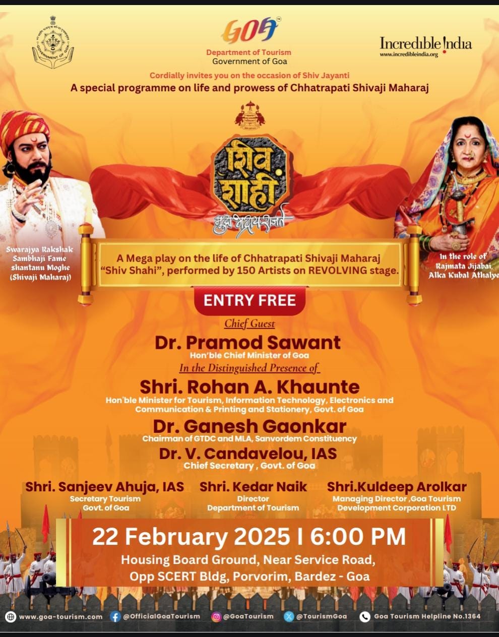 जाहिरात # ADVT #GoaTourism presents #ShivShahi—a grand theatrical spectacle on the life of #ChhatrapatiShivajiMaharaj! Witness history come alive with 150 artists performing on a revolving stage. Published 1 year ago on February 22, 2025 By Devendra Walavalkar Spread the love #GoaTourism presents #ShivShahi—a grand theatrical spectacle on the life of #ChhatrapatiShivajiMaharaj! Witness history come alive with 150 artists performing on a revolving stage. 22nd February 2025 | 6:00 PM Housing Board Ground, Porvorim, Goa Related Topics:futured Up Next RISE International Preschool, Dona Paula, Recognized as #1 in Goa for Campus Design Excellence Don't Miss पारदर्शकता, जबाबदारी आणि सुशासनाला चालना देण्यासाठी माहिती अधिकार कायदा एक शक्तिशाली साधन: केंद्रीय मुख्य माहिती आयुक्त Devendra Walavalkar Continue Reading You may like