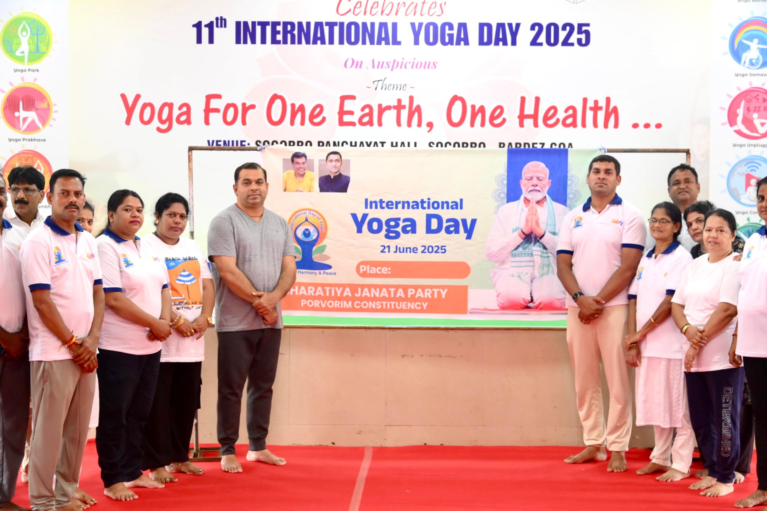 Goa Khabar : The Department of Tourism and Goa Tourism Development Corporation organized the 11th International Yoga Day in a grand and spirited manner at the Socorro Panchayat Hall, where over 150 participants gathered in a collective embrace of wellness, mindfulness, and community harmony. The celebrations reflected the State’s growing emphasis on integrating yoga and holistic health into its tourism narrative.