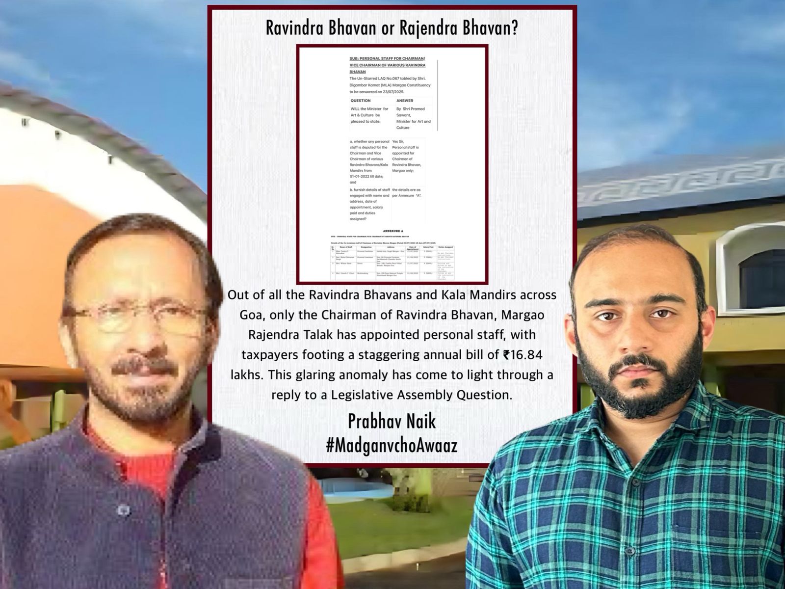 गोवा खबर : २३ जुलै रोजी गोवा विधानसभेत दिलेल्या उत्तरातून रवींद्र भवन, मडगावचे अध्यक्ष राजेंद्र तालक यांनी सार्वजनिक निधीचा कसा गैरवापर केला आहे, हे उघड झाले आहे. संपूर्ण गोव्यातील सर्व रवींद्र भवन आणि कला मंदिरांपैकी फक्त मडगावमध्येच अध्यक्षांनी दोन महिला वैयक्तिक सहायिका, एक पुरुष चालक आणि एक मल्टी-टास्किंग कर्मचारी असे वैयक्तिक कर्मचारी नियुक्त केले आहेत. हे सर्व कर्मचारी अध्यक्षाच्या वैयक्तिक सेवेसाठी नियुक्त असून त्यांचा एकूण वार्षिक पगार १६.८४ लाख आहे, अशी माहिती मडगावचो आवाज आणि युवक नेते प्रभव नायक यांनी उघड केली आहे.