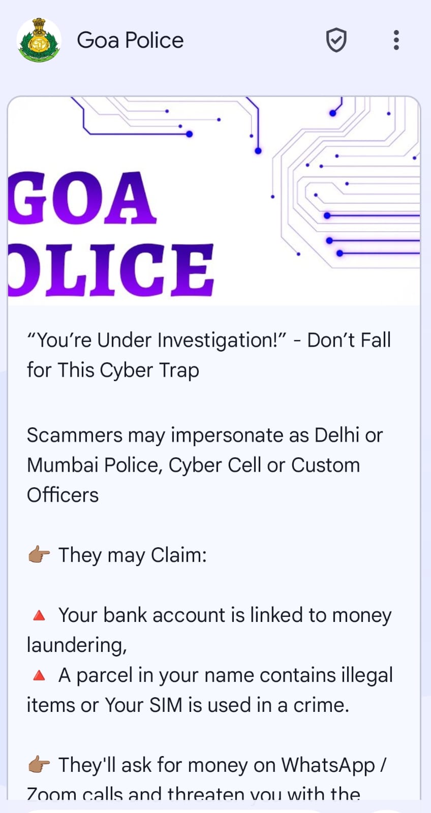 **Goa Police urges all citizens to stay alert, not engage with suspicious messages or calls, and report cybercrime immediately.**
