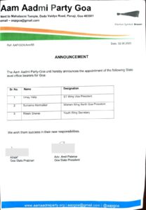 Goa Khabar:In a major organisational revamp, the Aam Aadmi Party’s Goa unit today announced the appointment of new state-level office bearers.