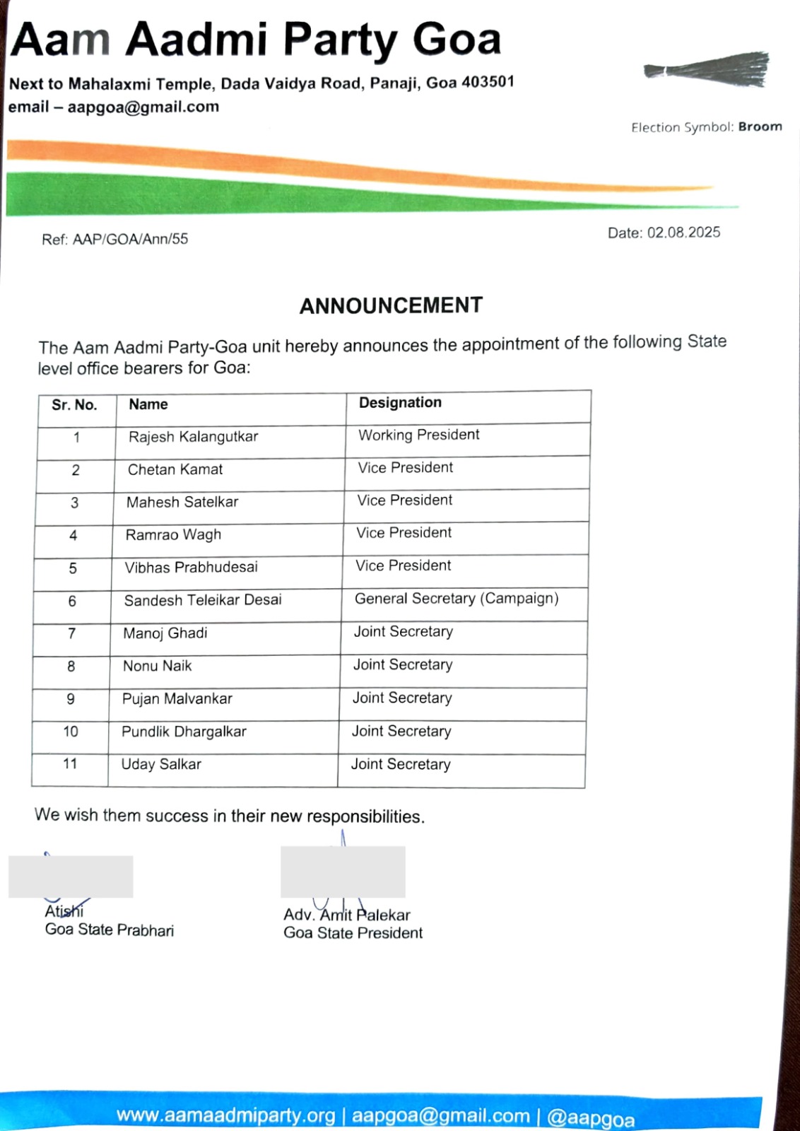 Rajesh Kalangutkar has been appointed as the Working President of the party in Goa. Chetan Kamat, Mahesh Satelkar, Ramrao Wagh, and Vibhas Prabhudesai have been named as Vice Presidents.