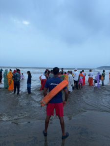 Goa Khabar:On the occasion of Chhath Puja, Drishti Marine lifesavers maintained a vigilant presence along Goa’s beaches, ensuring the safety of devotees performing rituals along the coast. A Drishti Marine lifesaver equipped with a rescue tube is seen keeping an eye on a group of worshippers offering prayers at Miramar beach.