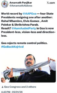 काँग्रेस नेते अमरनाथ पणजीकर यांनी सोशल मीडियावर एक पोस्ट शेअर करत ‘आप’वर टीका केली आहे. त्यांच्या मते, गोव्यात आम आदमी पक्षाने एक ‘जागतिक विक्रम’ केला असून, राहुल म्हांबरे, एल्विस गोम्स, अमित पालेकर आणि श्रीकृष्ण परब अशा चार प्रदेशाध्यक्षांनी एकापाठोपाठ एक राजीनामे दिले आहेत.