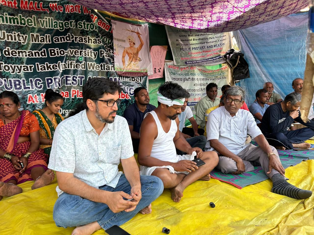 Goa Khabar : Aam Aadmi Party (AAP) President Valmiki Naik visited the Chimbel protest site today, throwing his full weight behind the local community’s fight against the proposed Unity Mall. Naik made a passionate appeal to the public to sustain the agitation until the government officially scraps the project.