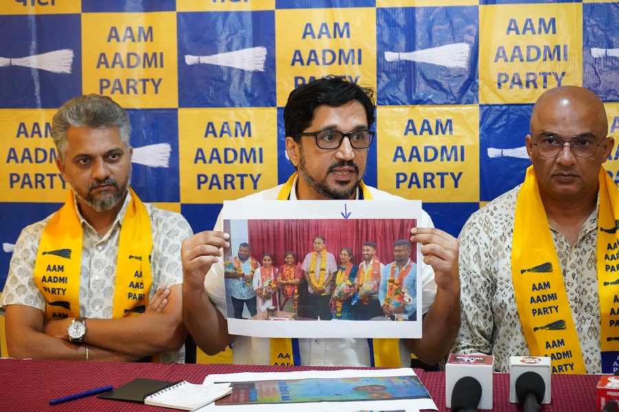 AAP State President Valmiki Naik, along with Senior Vice President Sandesh Teleikar Dessai, General Secretary Adv. Surel Tilve, and Mahila Wing President Mamata Maben, addressed the media to expose what they termed a “tripartite nexus.”