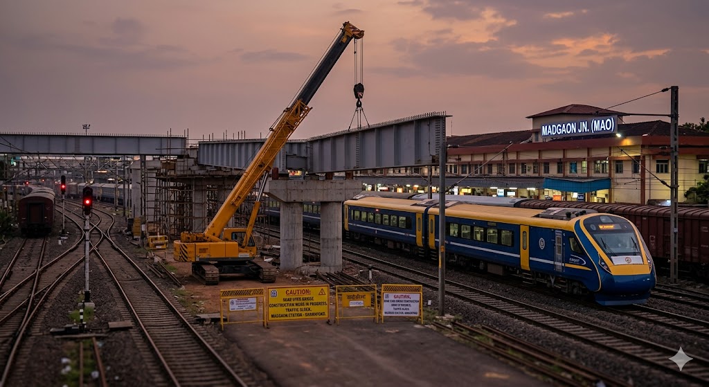 Goa Khabar : Konkan Railway has announced a series of Traffic and Power blocks at Madgaon Junction to facilitate the construction of a new Road over Bridge (RoB) at Rawanfond. The work, which involves the launching of composite girders, will take place from April 21 to April 24, 2026.