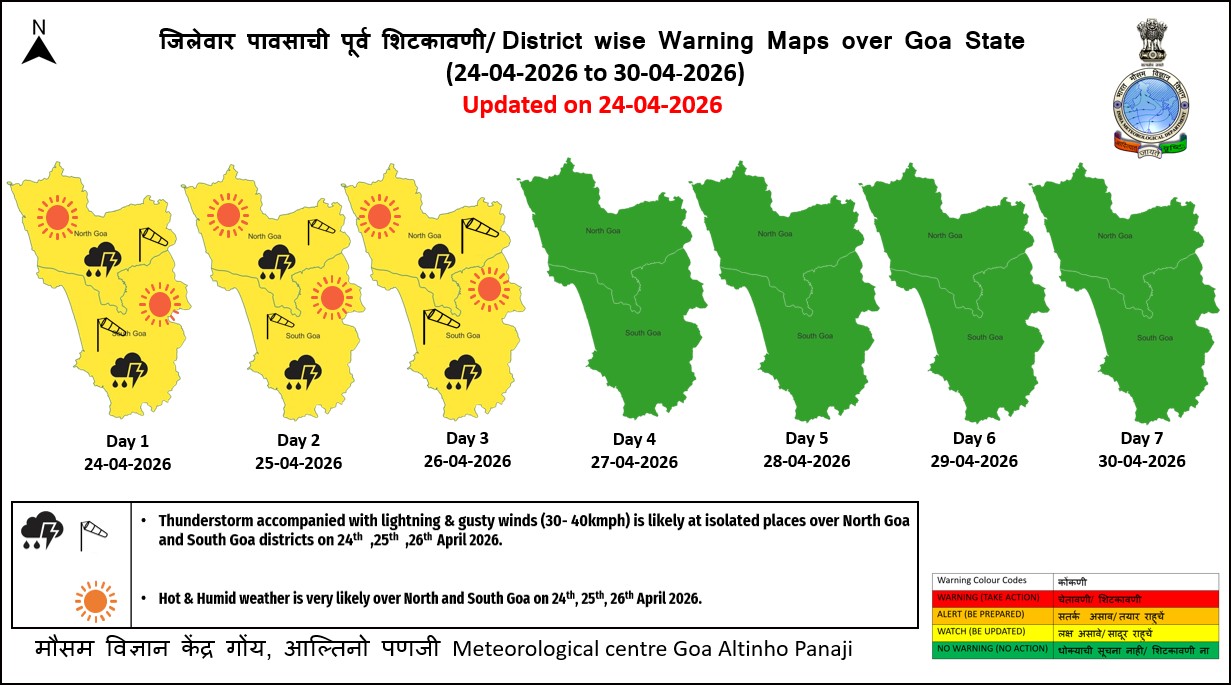 गोवा खबर : गोवा हवामान खात्याने (Meteorological Centre Goa, Altinho Panaji) २४ ते ३० एप्रिल २०२६ या कालावधीसाठी जिल्हानिहाय तापमान व हवामानाचा अंदाज जाहीर केला असून, २४, २५ आणि २६ एप्रिल दरम्यान राज्यात वादळी पावसासह विजांचा कडकडाट आणि जोरदार वारे वाहण्याची शक्यता व्यक्त करण्यात आली आहे.