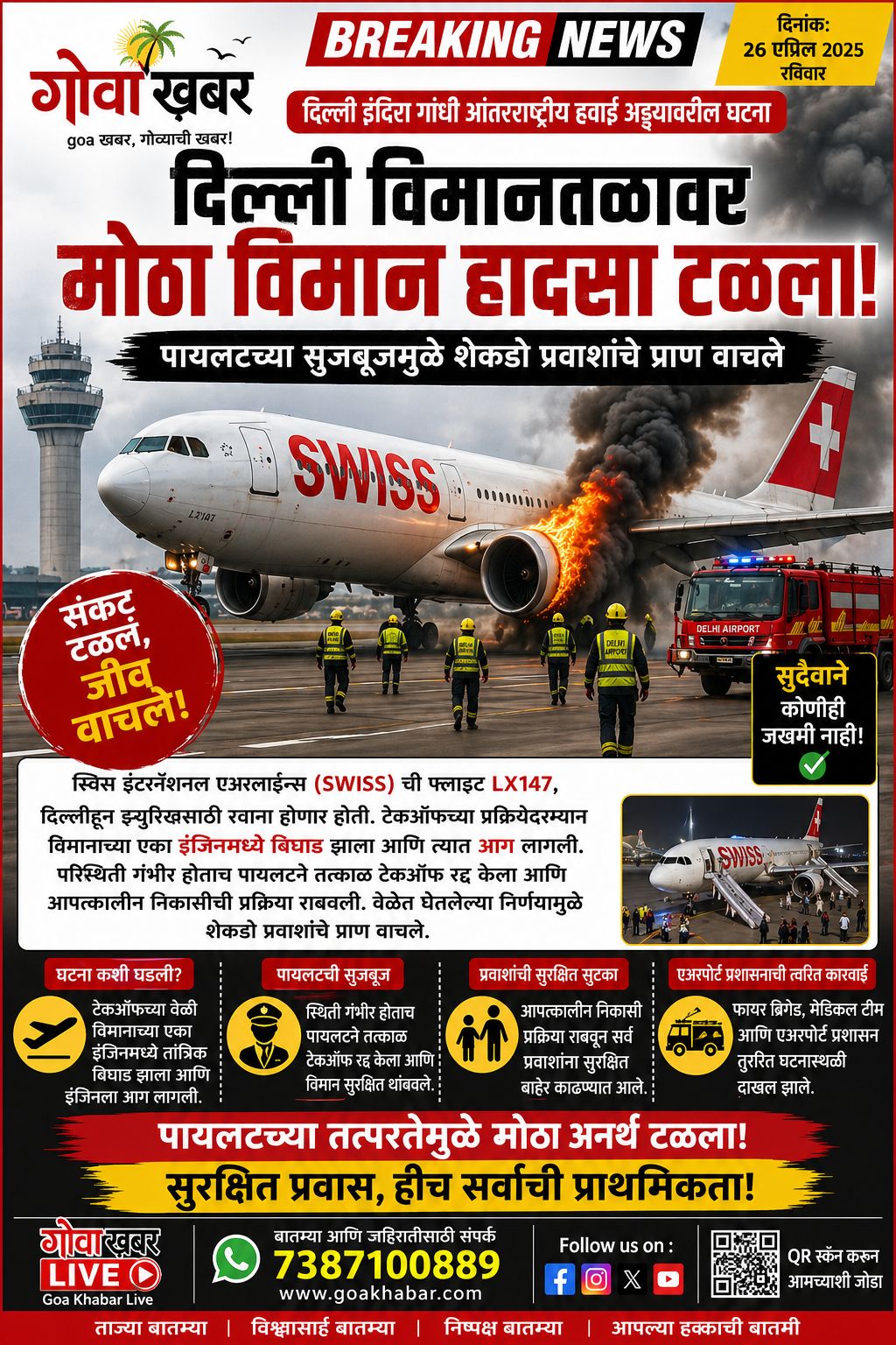Goa Khabar: major aviation disaster was narrowly averted at Indira Gandhi International Airport on Sunday after a technical failure led to a fire in an aircraft engine during takeoff.