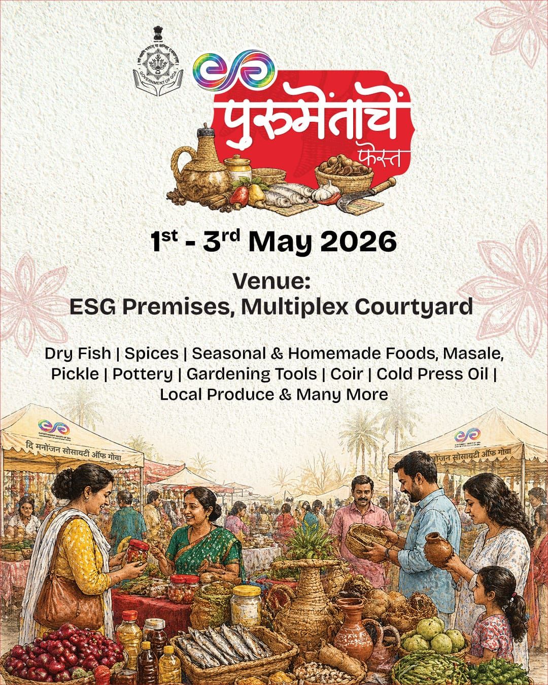 Goa Khabar:The Entertainment Society of Goa (ESG) is organizing “Purumentachem Fest” at the Multiplex Courtyard from 1st to 3rd May 2026. We are inviting applications from Goan artisans, self-help groups, entrepreneurs, and food vendors for setting up stalls to showcase and sell products traditionally used during the monsoon season.