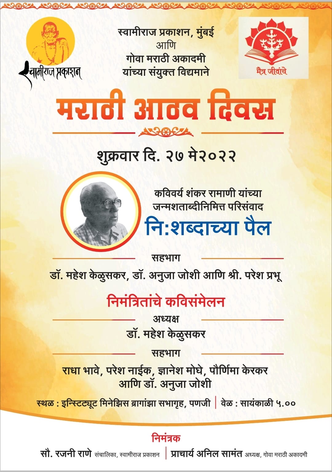 स्वामीराज प्रकाशन आणि गोवा सरकारच्या गोवा मराठी अकादमीच्या संयुक्त विद्यमाने होणाऱ्या या कार्यक्रमात गोमंतकीय कविवर्य शंकर रामाणी यांच्या जन्मशताब्दीनिमित्त *निःशब्दाच्या पैल’ हा परिसंवाद आयोजित करण्यात आला आहे. या परिसंवादात ज्येष्ठ कवी डॉ. महेश केळुसकर, कवयित्री व शंकर रामाणी यांच्या समग्र कवितेच्या संपादक डॉ. अनुजा जोशी व दैनिक नवप्रभाचे संपादक तसेच शंकर रामाणी यांच्या “एकट्याचे गाणे’ या पत्रसंग्रहाचे संपादक श्री. परेश प्रभू यांचा सहभाग असेल.
