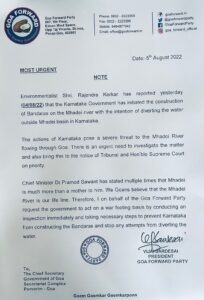 पणजी:म्हादईच्या खोऱ्यात कर्नाटक सरकार लहान बंधारे बांधून आता पाणी वळविण्याचा डाव खेळत आहे. कर्नाटकचे हे कारस्थान गोव्यासाठी मारक असून कर्नाटकचा हा डाव हाणून पाडा. त्यांच्या विरोधात सर्वोच्च न्यायालयात अवमान याचिका दाखल करा अशी मागणी करणारे पत्र गोवा फॉरवर्डचे अध्यक्ष विजय सरदेसाई यांनी मुख्य सचिवांना पाठविले आहे.
