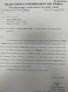गोवा खबर:आप गोवा डेस्क-प्रभारी आणि दिल्लीच्या आमदार आतिशी यांनी आज माहिती दिली, की गोवा राज्यातील आम आदमी पक्षाला राज्य पक्ष म्हणून मान्यता देणारी अधिकृत अधिसूचना, भारतीय निवडणूक आयोगाकडून प्राप्त झाली आहे.