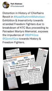 गोवा सरकारतर्फे आयोजित “आझादी का अमृत महोत्सव” प्रदर्शनात कुंकळ्ळी लढ्याच्या इतिहासाच्या माहितीतील विपर्यासावर प्रतिक्रिया व्यक्त करताना, चीफटेन्स मेमोरियल ट्रस्टने घेतलेल्या आक्षेपाशी कुंकळ्ळीचे आमदार युरी आलेमाव यांनी पूर्ण सहमती व्यक्त केली.