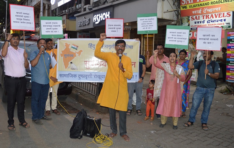 गोवा खबर:राज्य परिवहन विभागाच्या आदेशानुसार एस्.टी. बसेच्या दीडपटच दर आकरण्याचा शासनाचा निर्णय असतांना गणेशोत्सवासाठी गावाला जाणार्या भाविकांकडून खासगी ट्रॅव्हल्स तिकिटाचे दुप्पट–तिप्पट दर आकारून प्रवाशांची प्रचंड लुटमार करत आहेत. खासगी ट्रॅव्हल्सच्या संकेतस्थळांवर तिकिटांचे भरमसाठ तिकिटदर उघडपणे देण्यात आले आहेत. अशा प्रकारे नागरिकांची उघडपणे आर्थिक लुट चालू असूनही त्यांवर प्रशासन कोणतीही कारवाई करण्यात आलेली नाही. या विरोधात हिंदु जनजागृती समितीच्या ‘सुराज्य अभियान’च्या वतीने मुंबईतील दादर (पूर्व) येथील खासगी ट्रॅव्हल्सच्या बुकींग केंद्रांच्या बाहेर आंदोलन करण्यात आले. या आंदोलनामध्ये भाविकांची आर्थिक लुट करणार्या खासगी ट्रॅव्हल्सच्या विरोधात कठोर कारवाईची मागणी करण्यात आली.