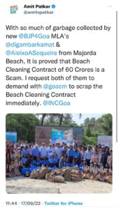गोवा लोकायुक्तांनी राम क्लीनर्स अँड डेव्हलपर्स आणि भूमिका क्लीनटेक सर्व्हिसेस या दोन कंत्राटदारांकडुन झालेल्या किनारे सफाई घोटाळ्याची चौकशी करण्याचे आदेश दिले होते. त्यानंतर दृष्टी लाईफसेव्हिंगला दिलेल्या कंत्राटातही असाच घोटाळा झाल्याचे आढळून आले होते. सध्याचा कर्नाटक इंडस्ट्रीयल अँड कमर्शियल हा ठेकेदार कोणतेही काम करत नसल्याने गोव्यातील विविध समुद्रकिनाऱ्यांवर कचऱ्याचे ढीग साचले आहेत व त्यामुळेच आज सगळीकडे कचरा गोळा झाला, असे अमित पाटकर यांनी निदर्शनास आणून दिले.