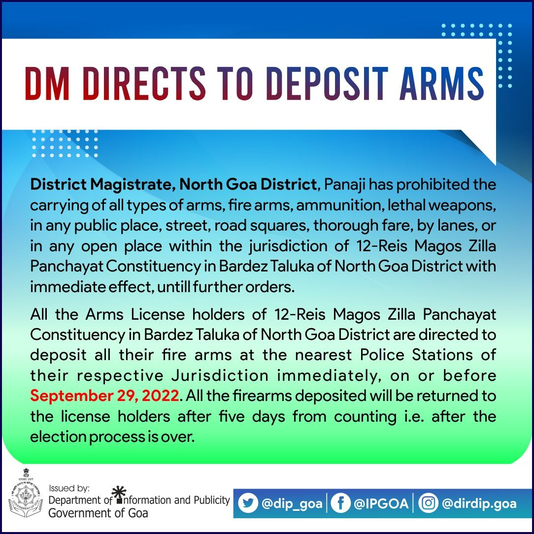 रेईस मागूस जिल्हा पंचायत मतदारसंघातील परवानाधारक शस्त्र मालकांनी आपली शस्त्रे, बंदुका आपल्या जवळच्या संबंधित पोलीस स्टेशनवर २९ सप्टेंबर २०२२ पर्यंत जमा करण्याचा आदेश दिला आहे. जमा केलेली शस्त्रे मतमोजणींच्या पाच दिवसांनंतर म्हणजे निवडणूक प्रक्रिया पूर्ण झाल्यानंतर परत केली जातील.