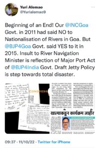पर्यटन विभागान जेट्टी धोरण – २०२२ चा मसुदा हा देखील गोव्याच्या सर्वनाशाच्या दिशेने टाकलेले एक पाऊल आहे. हे धोरण आपला सुंदर गोवा पंतप्रधान नरेंद्र मोदी यांच्या क्रोनी क्लबकडे सोपवण्याचे भाजप सरकारचे कारस्थान आहे. सरकारने जनतेच्या भावना ऐकल्या पाहिजेत. समाजसेवी संस्था आणि समाज कार्यकर्त्यांनी गोव्याचे रक्षण करण्यासाठी संघर्ष केला आहे आणि गोव्याची अस्मिता जपण्यासाठी त्यांना पाठिंबा देणे हे आपले कर्तव्य आहे, असे युरी आलेमाव यांनी सांगितले.