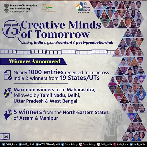 Sharing his vision for 75 Creative Minds of Tomorrow, the Union I&B Minister said: “75 Creative Minds of Tomorrow has been conceived as a unique platform of opportunities for youth, artists and creatives, especially from far-flung areas, to learn, engage and network with the who’s who of the Indian Film Industry at the International Film Festival of India in Goa. This year, in what is just the second edition of 75 Creative Minds of Tomorrow, nearly 1,000 entries were received from all across India, including from places such as Lakhimpur and Sonitpur in Assam, Khorda in Odisha, Krishna and Prakasam in Andhra Pradesh, Theni in Tamil Nadu and Bhandara in Maharashtra, to name a few. 75 Creative Minds have been handpicked to be mentored, from among these applications. I congratulate everyone and look forward to meeting all of them at the 53rd IFFI.”