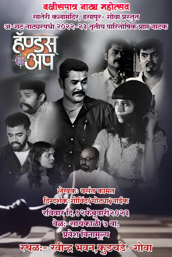 गोवा खबर : पेडणे येथे नटवर्य स्व. प्रभाकर पणशीकर स्मृती महोत्सव आयोजित केला असून आज शनिवार दि १८ मार्च रोजी सायंकाळी ठीक ७. ०० वा ‘अ ‘गट राज्यनाट्य स्पर्धेतील तृतीय क्रमांक पारितोषिक विजेते व गोवा राज्य ब गटराज्यनाट्य स्पर्धेत सलग तीन वर्षे तिन्ही पारितोषिक प्राप्त संस्था सातेरी कलामंदिर हसापुर, गोवा प्रस्तुत व प्रसिद्ध नाटककार वसंत कामत लिखीत दोन अंकी नाटक “हँडस अप” सादर होईल.