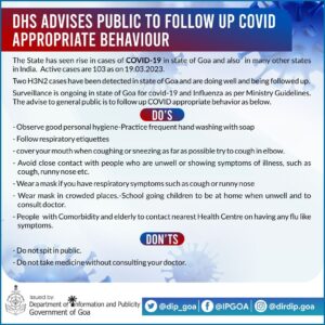 गोवा खबर:गोवा राज्यात तसेच भारतातील इतर राज्यांमध्ये कोविड-१९ च्या रुग्णांमध्ये वाढ होताना दिसून येत आहे. १९ मार्च २०२३ रोजीपर्यंत राज्यातील सक्रिय रुग्णांची संख्या १०३ एवढी आहे, असे आरोग्य संचालनालयातर्फे कळविण्यात आले आहे. राज्यात एच३एन२ चे दोन रुग्ण सापडले असून त्यांचे आरोग्य ठीक आहे असे कळविण्यात आले आहे.