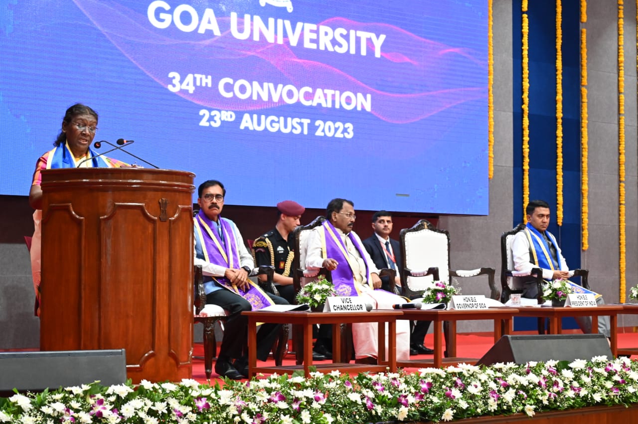 गोवा खबर:भारताच्या राष्ट्रपती श्रीमती. द्रौपदी मुर्मू यांनी दोना पावला येथील राजभवनात आयोजित केलेल्या गोवा विद्यापीठाच्या ३४ व्या दीक्षांत समारंभात विध्यापिठाचे शैक्षणिक उपक्रम आणि नवकल्पनांची प्रशंसा केली आणि विद्यार्थ्यांच्या उल्लेखनीय कामगिरीबद्दल आनंद व्यक्त केला.