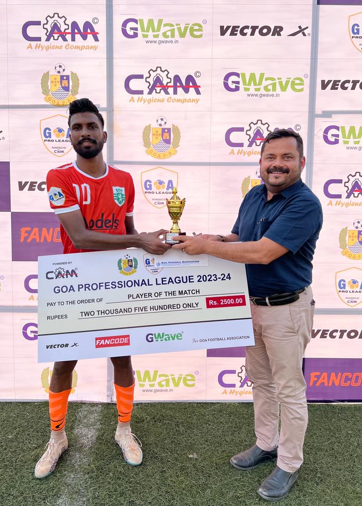 Pic caption: GFA Executive Member Ravindra Cabral presenting the player of the match award to Sporting Clube de Goa’s Lloyd Cardozo.