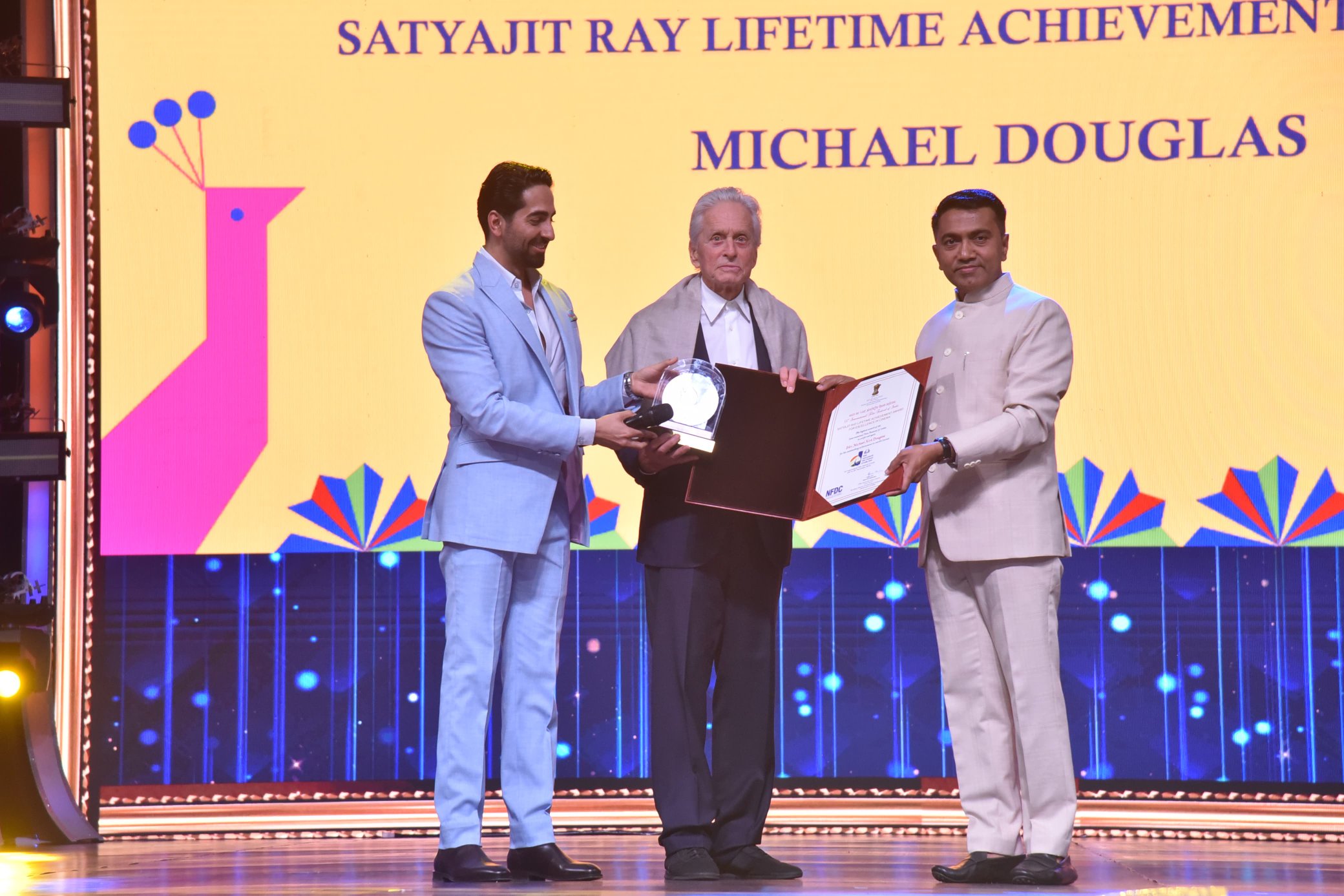Goa Khabar:Renowned Hollywood actor and producer Michael Douglas was honoured with the prestigious Satyajit Ray Lifetime Achievement Award for Excellence in Cinema at the 54th International Film Festival of India (IFFI) in Goa today.