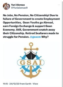 गोवा खबर:नोकऱ्या नाहीत, पेन्शन नाही, नागरिकत्व नाही. रोजगाराच्या संधी निर्माण करण्यात भाजपा सरकारच्या अपयशामुळे, गोव्यातील तरुण परदेशात जातात, परकीय चलन मिळवतात आणि गोव्याच्या अर्थव्यवस्थेला आधार देतात. तरीही भाजप सरकार त्यांचे नागरिकत्व हिसकावून घेते. निवृत्त खलाशांना पेन्शनसाठी संघर्ष करावा लागतो. भाजप सरकार आपल्या गोमंतकीयांचा असा छळ का करत आहे हे मुख्यमंत्री डॉ. प्रमोद सावंत यांनी स्पष्ट करावे अशी मागणी विरोधी पक्षनेते युरी आलेमाव यांनी केली आहे.