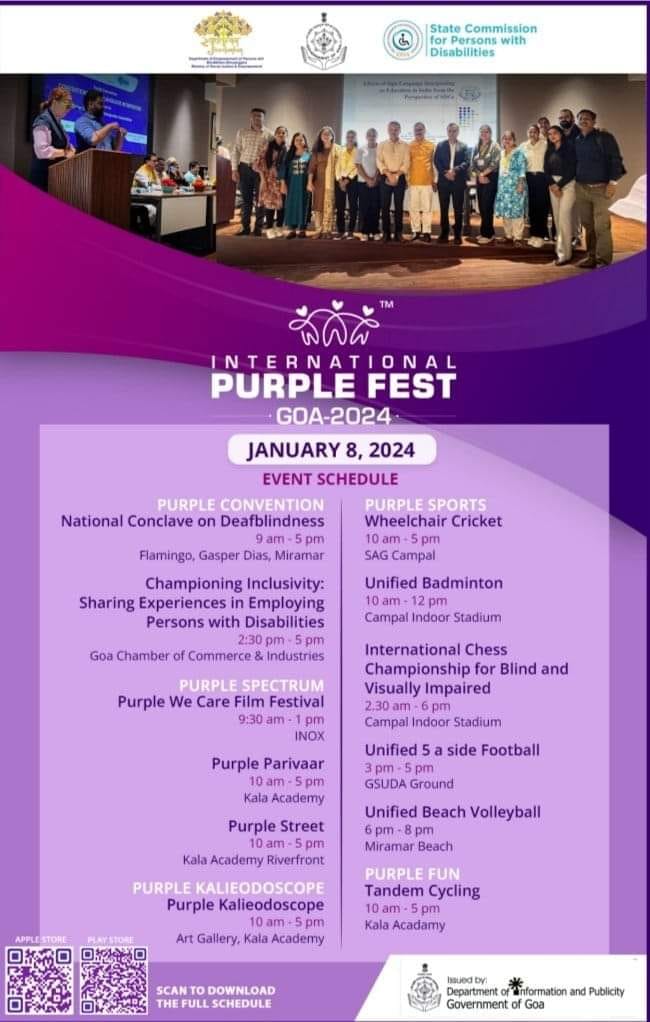 #Advt Opening Ceremony of #internationalPurpleFest Goa-2024 will be held on January 8, 2024, at 4:30 pm, which is Organised by Goa State Disability Commission & Directorate of Social Welfare, Govt. of Goa In collaboration with Department of Empowerment of Persons with Disabilities, Ministry of Social Justice and Empowerment, Government of India.