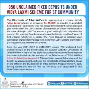 दरम्यान २०११-२०१२ ते २०१८-२०१९ पर्यंत सुमारे ९५० लाभधारकांची कायम ठेव हक्क न सांगता आदिवासी कल्याण संचालनालयाकडे पडून आहे. अशा हक्क न सांगितलेल्या कायम ठेव अर्जदारांची यादी आदिवासी कल्याण संचालनालयाच्या ( https://tribalwelfare.goa.gov.in ) वेबसाइटवर अपलोड करण्यात आली आहे. या अर्जदारांनी आपली कायम ठेव रक्कम मिळविण्यासाठी ही सूचना जारी झाल्यापासून ९० दिवसांच्या आत आदिवासी कल्याण संचालनालय, पणजी किंवा मडगांव येथील कचेरीत संपर्क करावा. असे न केल्यास अर्जदारांची रक्कम सरकारी तिजोरीत जमा करण्यात येईल.