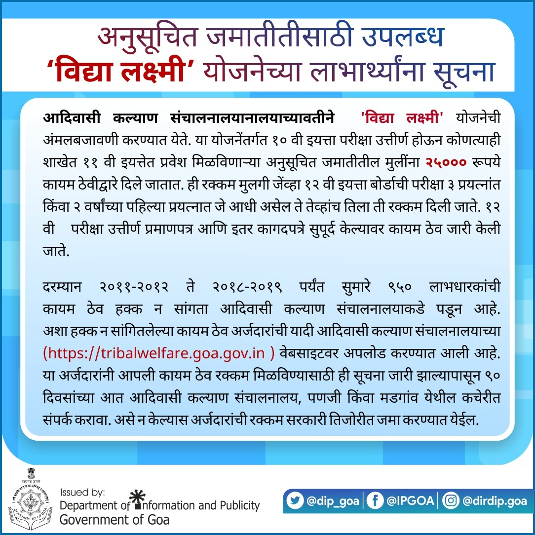 गोवा खबर:आदिवासी कल्याण संचालनालयानालयाच्यावतीने ‘विद्या लक्ष्मी’ योजनेची अंमलबजावणी करण्यात येते. या योजनेंतर्गत १० वी इयत्ता परीक्षा उत्तीर्ण होऊन कोणत्याही शाखेत ११ वी इयत्तेत प्रवेश मिळविणाऱ्या अनुसूचित जमातीतील मुलींना २५००० रूपये कायम ठेवीद्वारे दिले जातात. ही रक्कम मुलगी जेंव्हा १२ वी इयत्ता बोर्डाची परीक्षा ३ प्रयत्नांत किंवा २ वर्षांच्या पहिल्या प्रयत्नात जे आधी असेल ते तेव्हांच तिला ती रक्कम दिली जाते. १२ वी परीक्षा उत्तीर्ण प्रमाणपत्र आणि इतर कागदपत्रे सुपूर्द केल्यावर कायम ठेव जारी केली जाते.