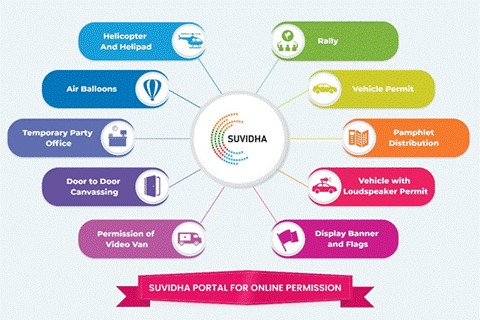 सुविधा पोर्टल (https://suvidha.eci.gov.in) च्या माध्यमातून राजकीय पक्ष आणि उमेदवार अतिशय सहजतेने कोणत्याही वेळी, कोणत्याही भागातून परवानगीसाठी विनंती अर्ज पाठवू शकतात. त्या व्यतिरिक्त सर्व हितधारकांना समावेशकता आणि समान संधी सुनिश्चित करण्यासाठी ऑफलाईन सादरीकरणाचा पर्याय देखील उपलब्ध आहे.
