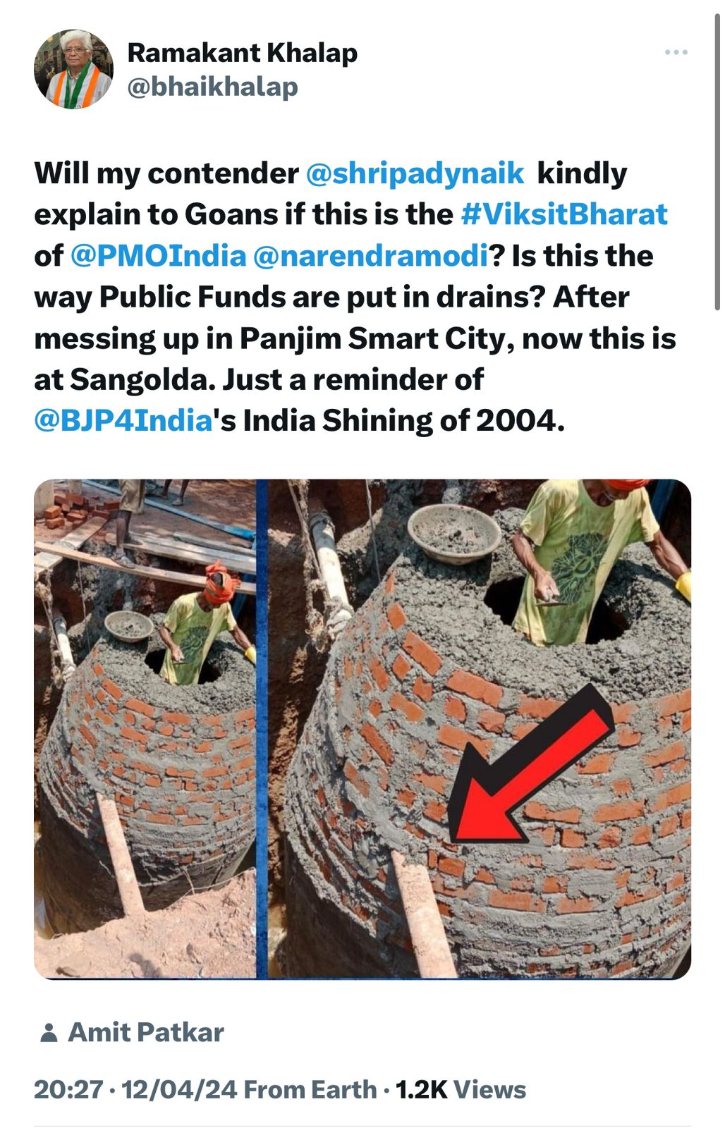 गोवा खबर: करदात्यांचे पैसे गटारात टाकणे हाच पंतप्रधान नरेंद्र मोदींचा ‘विकसीत भारत’ आहे का, याचे उत्तर माझे प्रतिस्पर्धी उमेदवार श्रीपाद नाईक गोमंतकीयांना देतील का? अशा प्रकारे सार्वजनिक निधी गटारांत टाकणे योग्य आहे का? पणजी स्मार्ट सिटीत गोंधळ झाल्यानंतर आता सांगोल्डा येथे बेजबाबदारपणाने काम केले जात आहे. 2004 ची इंडिया शायनिंग विसरू नका असा इशारा काँग्रेसचे उत्तर गोव्यातील उमेदवार ॲड. रमाकांत खलप यांनी भाजपला दिला आहे.