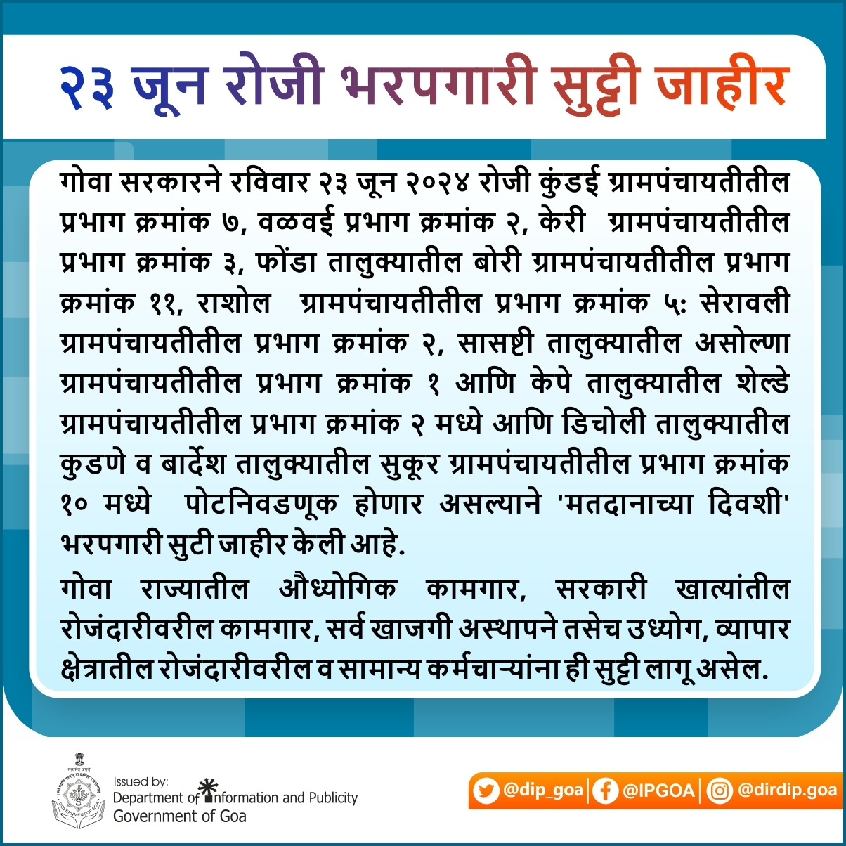गोवा खबर:गोवा सरकारने रविवार २३ जून २०२४ रोजी कुंडई ग्रामपंचायतीतील प्रभाग क्रमांक ७, वळवई प्रभाग क्रमांक २, केरी  ग्रामपंचायतीतील प्रभाग क्रमांक ३, फोंडा तालुक्यातील बोरी ग्रामपंचायतीतील प्रभाग क्रमांक ११, राशोल  ग्रामपंचायतीतील प्रभाग क्रमांक ५: सेरावली ग्रामपंचायतीतील प्रभाग क्रमांक २, सासष्टी तालुक्यातील असोल्णा ग्रामपंचायतीतील प्रभाग क्रमांक १ आणि केपे तालुक्यातील शेल्डे ग्रामपंचायतीतील प्रभाग क्रमांक २ मध्ये आणि डिचोली तालुक्यातील कुडणे व बार्देश तालुक्यातील सुकूर ग्रामपंचायतीतील प्रभाग क्रमांक १० मध्ये  पोटनिवडणूक होणार असल्याने ‘मतदानाच्या दिवशी’ भरपगारी सुटी जाहीर केली आहे.