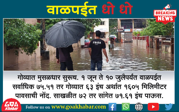 गोव्यात मुसळधार सुरूच. 1 जून ते 10 जुलैपर्यंत वाळपईत सर्वाधिक 75.51 तर गोव्यात 63 इंच अर्थात 1605 मिलिमीटर पावसाची नोंद. साखळीत 72 तर सांगेत 71.61 इंच पाऊस.