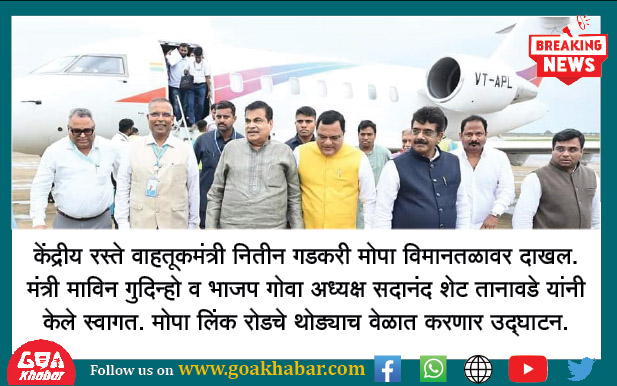 केंद्रीय रस्ते वाहतूकमंत्री नितीन गडकरी मोपा विमानतळावर दाखल. मंत्री माविन गुदिन्हो व भाजप गोवा अध्यक्ष सदानंद शेट तानावडे यांनी केले स्वागत. यावेळी संजीव देसाई, दामू नाईक आणि पेडणेचे आमदार प्रवीण आर्लेकर यांची होती उपस्थिती. मोपा लिंक रोडचे थोड्याच वेळात करणार उद्घाटन.