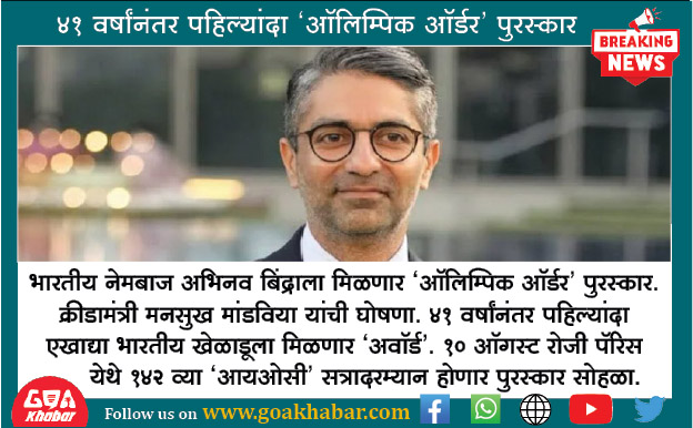 भारतीय नेमबाज अभिनव बिंद्राला मिळणार ‘ऑलिम्पिक ऑर्डर’ पुरस्कार. क्रीडामंत्री मनसुख मांडविया यांची घोषणा. 41 वर्षांनंतर पहिल्यांदा एखाद्या भारतीय खेळाडूला मिळणार ‘अवॉर्ड’. 10 ऑगस्ट रोजी पॅरिस येथे 142 व्या ‘आयओसी’ सत्रादरम्यान होणार पुरस्कार सोहळा.