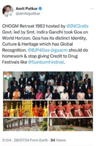 CHOGM Retreat 1983 hosted by then Congress Government led by Smt. Indira Gandhi took Goa on World Horizon. Goa has its distinct Identity, Culture & Heritage which has Global Recognition. BJP Government’s Chief Minister Dr. Pramod Sawant should do homework & stop giving Credit to Drug Festivals like Sunburn Festival, stated Amit Patkar.