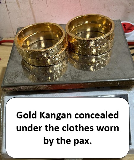 गुजरातमध्ये सुरत येथे राहणारा एक भारतीय नागरिक एअर इंडियाच्या एआय-984 या विमानाने दुबईहून मुंबईला आल्यावर त्याला थांबवून तपासणी केली असता त्याच्याकडे अशुद्ध स्वरूपातील 22 कॅरेट सोन्याचे एकूण 974.000 ग्रॅम वजनाचे कंगन (4 तुकडे) अंगावर लपवलेले आढळून आले. त्या व्यक्तीला अटक करण्यात आली.