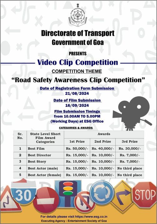 Goa Khabar : Directorate of Transport, Goa is organizing the 2nd Road Safety Awareness Clip Competition at state level during the forthcoming 13th Road Safety Week which shall be held in the month of September 2024, i.e. 23rd Sept – 29th Sept 2024, and will be executed by ESG.