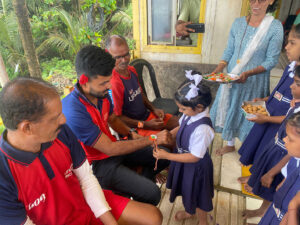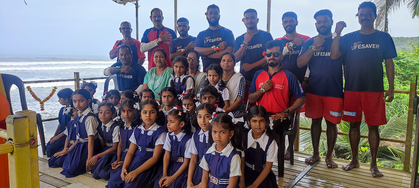 A young student from the government primary school at Deulwada in Arambol, North Goa, ties a rakhi to a Drishti Marine lifesaver at the lifesavers’ tower at the Arambol beach on the occasion of Raksha Bandhan. A rakhi symbolises protection and care, which are reflective of a lifesavers’ ethos.