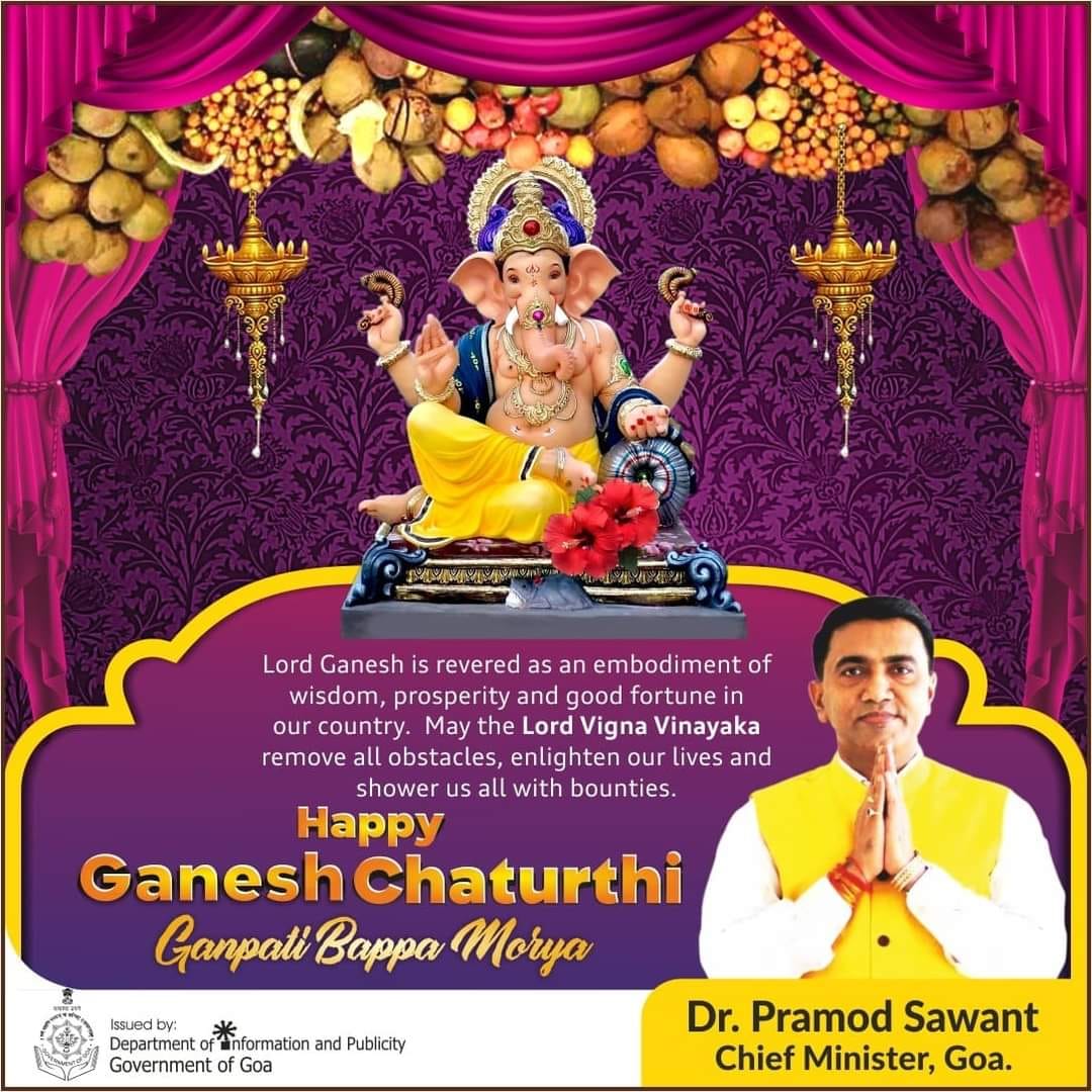 ADVT गोवा सरकार तर्फे गणेश चतुर्थीच्या हार्दिक शुभेच्छा!!! Dept of Information & Publicity – Goa