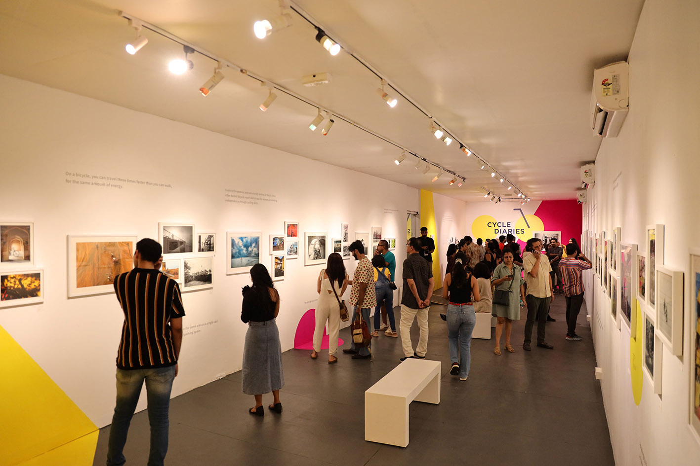 Mumbai-based freelance documentary photographer and photojournalist Asmita Parelkar utilised bright colours while designing the exhibition space for the cycle-themed segment to highlight the element of play, stating: “Complimenting the bright pops of colour in many of the photographs, the vibrant spatial design is a reminder that we all need elements of playfulness to spark joy within us.”