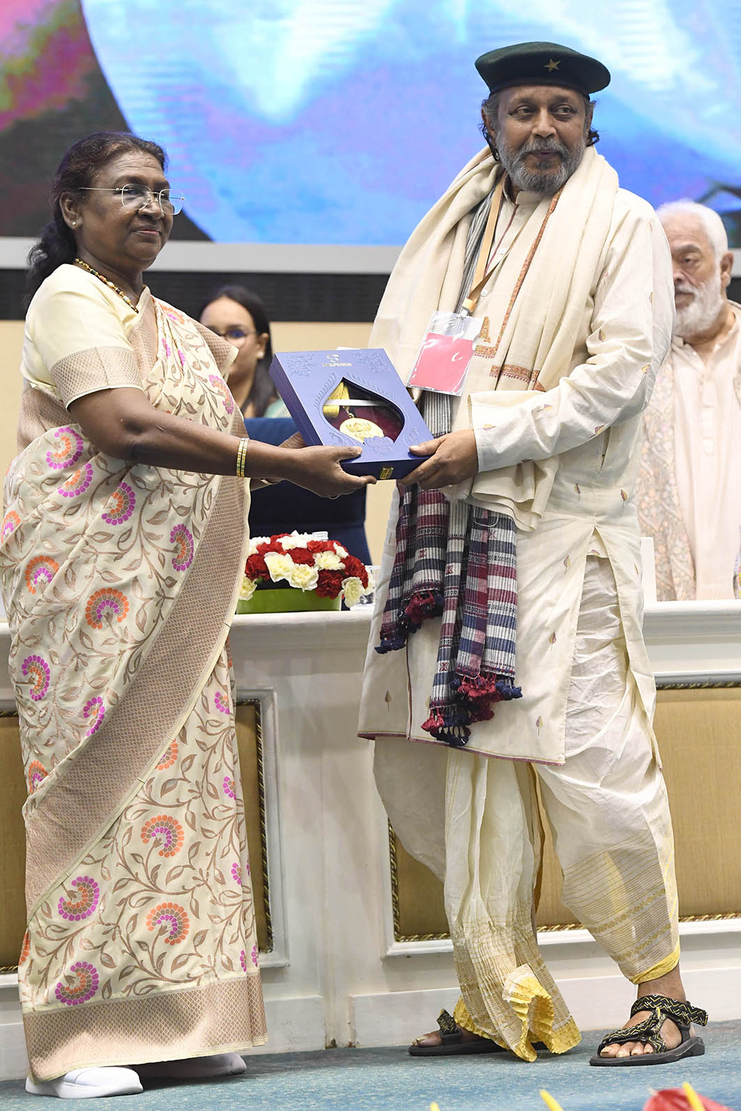 ज्येष्ठ अभिनेते मिथुन चक्रवर्ती यांना दादासाहेब फाळके जीवनगौरव पुरस्कार मिळाल्याबद्दल राष्ट्रपतींनी त्यांचे अभिनंदन केले. चित्रपट क्षेत्रातील सुमारे पन्नास वर्षांच्या कारकिर्दीत मिथुनजींनी केवळ गंभीर पात्रे रंगवली नाहीत तर सामान्य जीवनाबद्दलच्या कथा सांगणाऱ्या अनेक भूमिका त्यांनी त्यांच्या वैशिष्ट्यपूर्ण उर्जेने यशस्वीपणे साकार केल्या.
