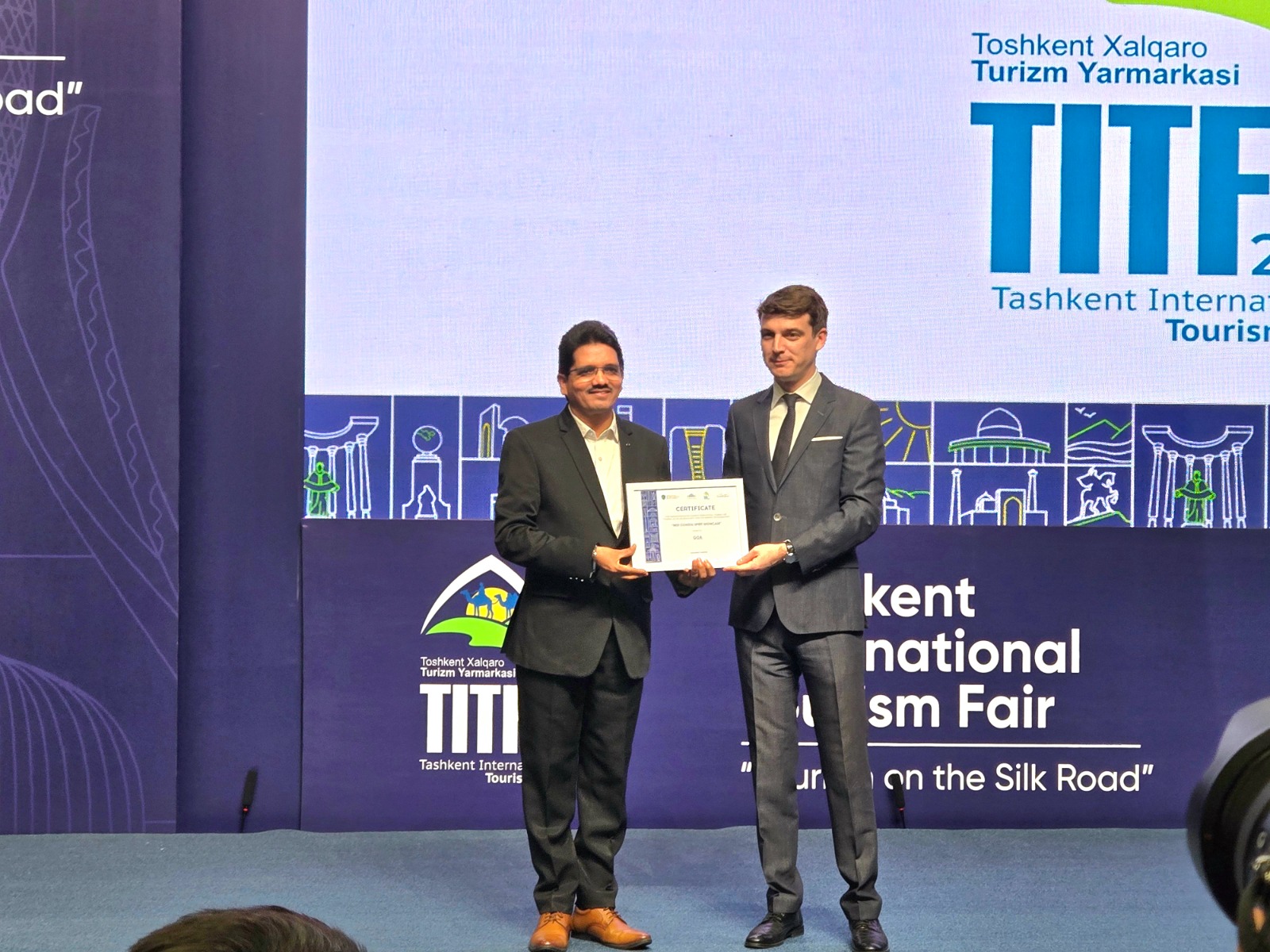 Goa Khabar : Goa has made an extraordinary mark on the global tourism scene by winning the prestigious ‘Best Coastal Spirit Showcase’ award at the Tashkent International Tourism Fair (TITF) 2024 held at the CAEx in Tashkent. The award was presented to Goa’s delegation by Mr. Dilshad Bahadirovich, Director of the “National PR-center” SUE under the Tourism Committee of the Republic of Uzbekistan. This remarkable achievement not only celebrates Goa’s diverse tourism offerings but also highlights its growing reputation as a key player in the international tourism industry.