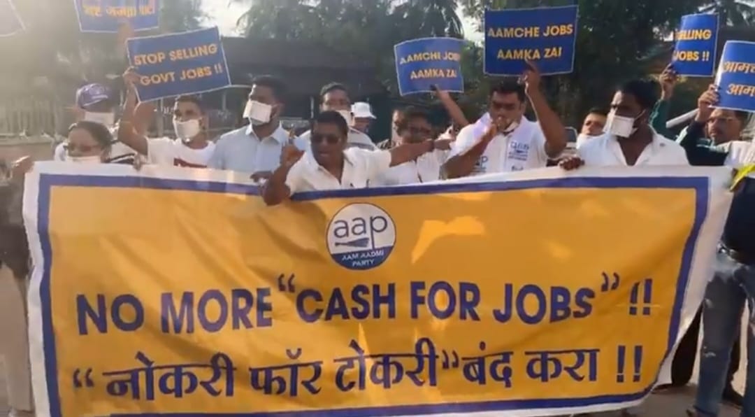 AAP MLAs Capt Venzy Viegas and Engr Cruz Silva, along with AAP Youth Wing leaders, held a protest in Navelim against the *Cash for Jobs* scam on Friday. They demanded strict action against the culprits involved.